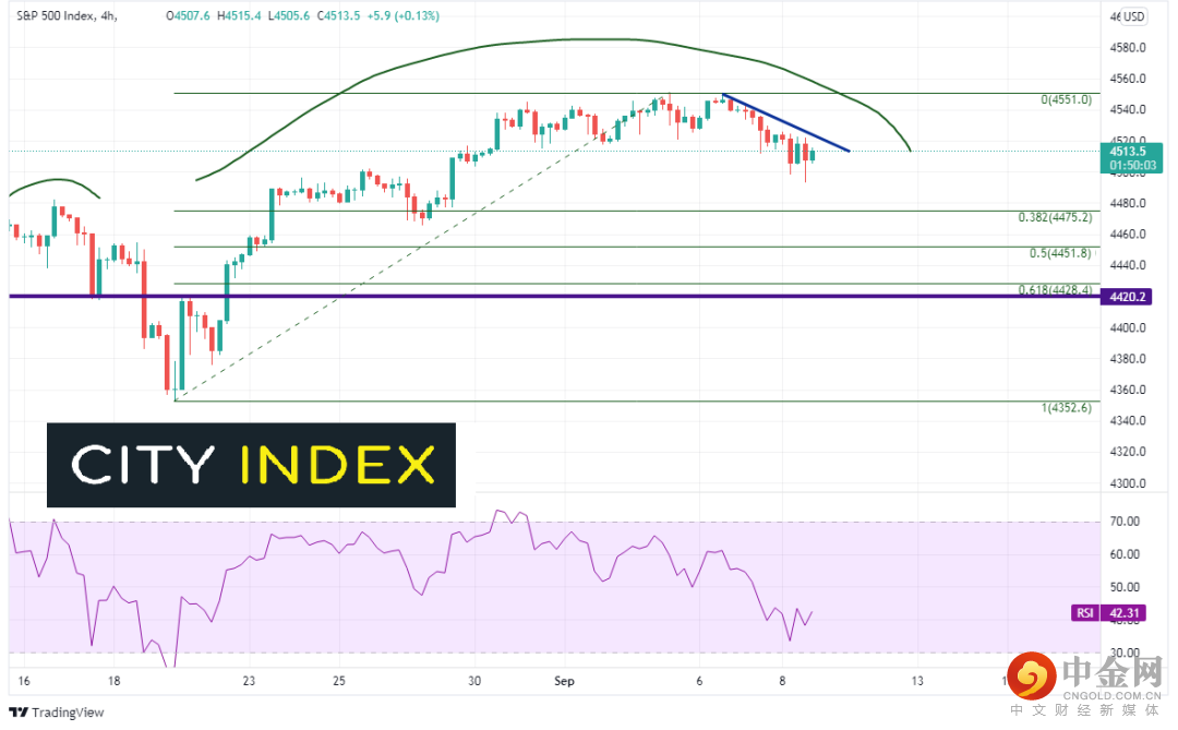 4小时图上,标普500指数似乎在构建圆顶形态(也有可能是头肩顶形态,只不过头部没有完成、右肩也没有成形)。4475是8月19日低点到9月3日高点行情的38.2%回档位,也在上升楔形下轨趋势线(4480)附近。
