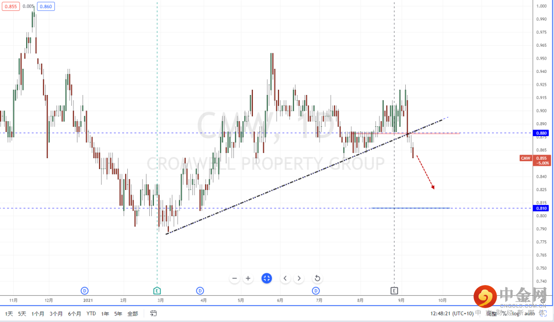 CMW:由于目前整体市场趋于低迷疲软阶段,从ETF整体产业标的迹象,都处在拐头下行过程中,并且导致市场人气不佳。从CMW趋势表现,在前期高位横盘后跌破上升趋势线,以及水平支撑带0.880附近。整体空头格局已经形成,短期可适当关注价格调整后继续下行的空头机会,下方目标位置参考0.810一带。