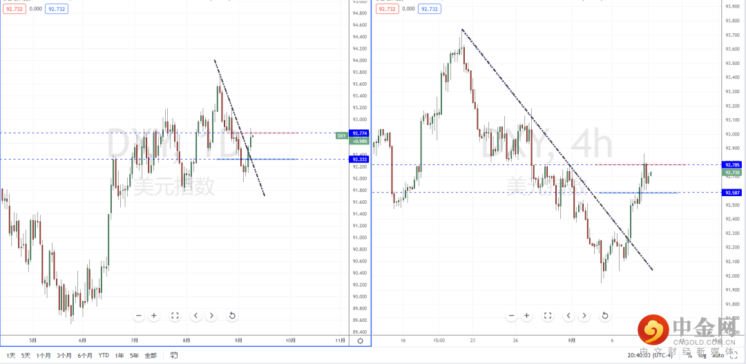 美元指数天图:短期价格在相对支撑区域回测起稳,并且有明显的转势迹象。下方水平支撑带在92.333附近,同时也突破下降趋势线的压制作用。从日内4小时级别,价格在反弹后短期承压。但趋势趋于偏多,可适当关注价格调整后继续上行的多头机会,上方区间目标位置参考93.029附近。