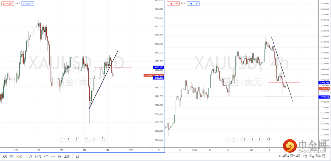 黄金天图:短期价格虽然坚决跌破上升趋势线,以及水平支撑带1806.363附近,形成空头格局,但下方有重要的水平支撑带在1782.152附近。并且短期空间幅度有限,从日内4小时级别,价格在短期支撑区域纠结。可适当关注价格在此阶段表现,如果破位将打开下方空头空间。反之,则止跌进入调整,