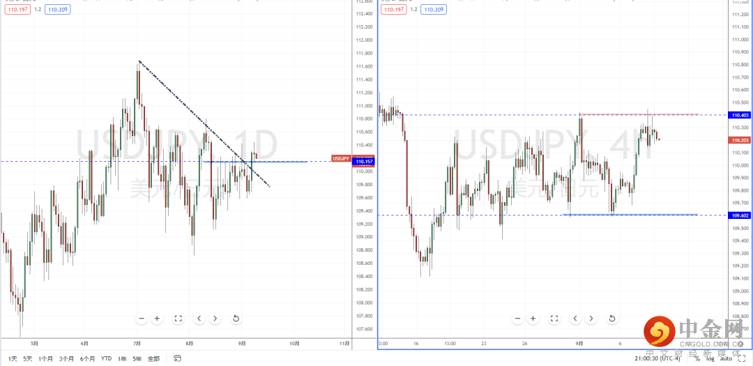 美日天图:目前行情虽然突破下降趋势线的压制作用,以及水平压制带。但趋势上行动能依然受阻。从日内4小时级别,整体格局继续处于在宽幅区间阶段调整。并且价格在冲击上方压制带110.403附近受阻,短期可关注价格在此区间的表现。如果突破上行将打开多头空间,反之,则继续横盘调整。