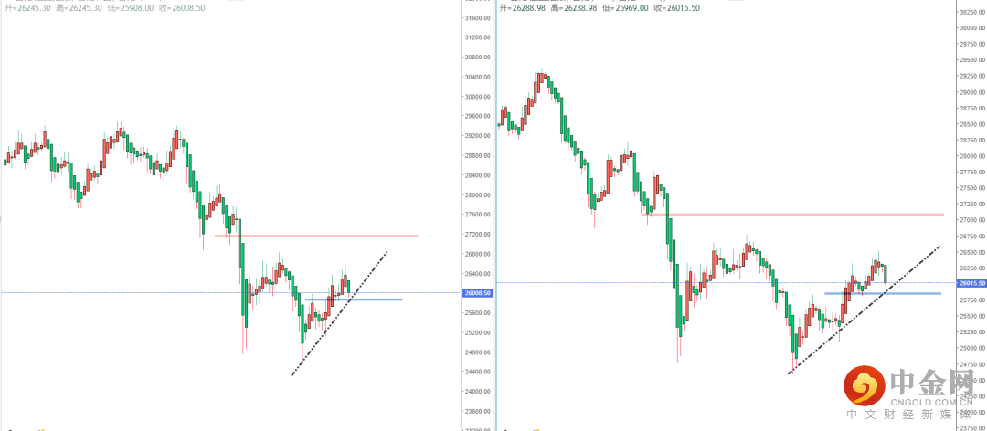 恒生指数天图:短期价格在冲击后小幅回落,但目前整体趋势继续保持多头方向,下方有上升趋势线的支撑作用,其水平支撑带在25836.59附近。从日内4小时级别,可适当关注价格有效测试后再次上行的多头机会,上方区间目标位置参考26883.88附近。