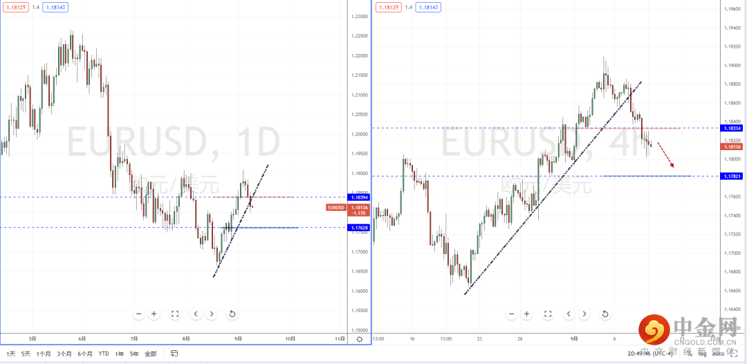 欧美天图:目前行情在冲击上方压制区域再次受阻,由于美元指数在关键位置的反转,使得欧美跌破关键支撑带1.18394附近,同时也跌破上升趋势线的支撑作用。从日内4小时级别,短期价格将持续下行,可适当关注价格调整后继续走弱的空头机会,下方目标位置参考1.17821附近