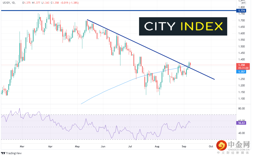 来看美国10年期债券收益率。收益率已站上5月高点以来的下降趋势线,周二还上破200天移动均线1.357,周三一直在该位附近徘徊。如果收上200天移动均线和周二高点(1.385),可能看涨并带动美元/日元走高。如果收盘回到1.338附近的趋势线下方,可能看跌,后市目标8月4日低点1.127附近,从而可能利空美元/日元。