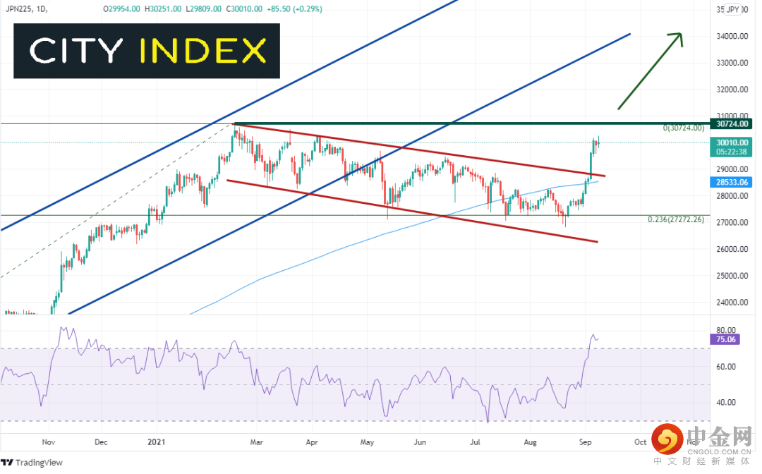 日本首相菅义伟宣布辞职后,看起来处于领先地位的候选人们纷纷给出新的疫情纾困计划,其中一位候选人提出一份金额高达30万亿日元的经济激励一揽子计划。受此影响,日经225指数摸至5个月高点,Topix涨至31年新高。另外,在股指走强、刺激计划有望出炉的背景下,日元兑包括美元在内的其它货币下跌。