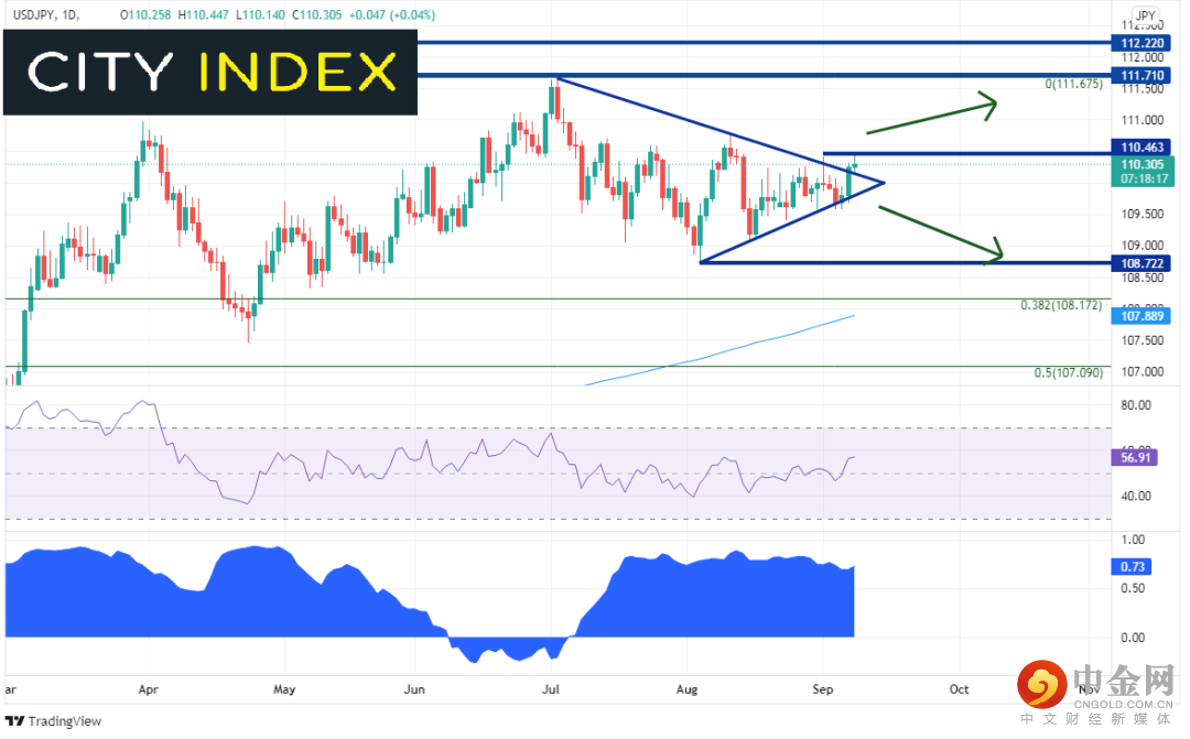 美元/日元日图自从测试了2020年3月高点并于7月2日创下111.71高点以来一直在一个对称三角形内震荡,周二时无限逼近三角形的相汇点,事实上在两条聚拢的趋势线的两端交投,并且当天收上上轨趋势线。到目前为止,该货币对延续涨势,摆脱三角形。但因为撞进水平阻力位110.46而动弹不得,如果站于其上,有望打开回升至7月2日高点的空间。