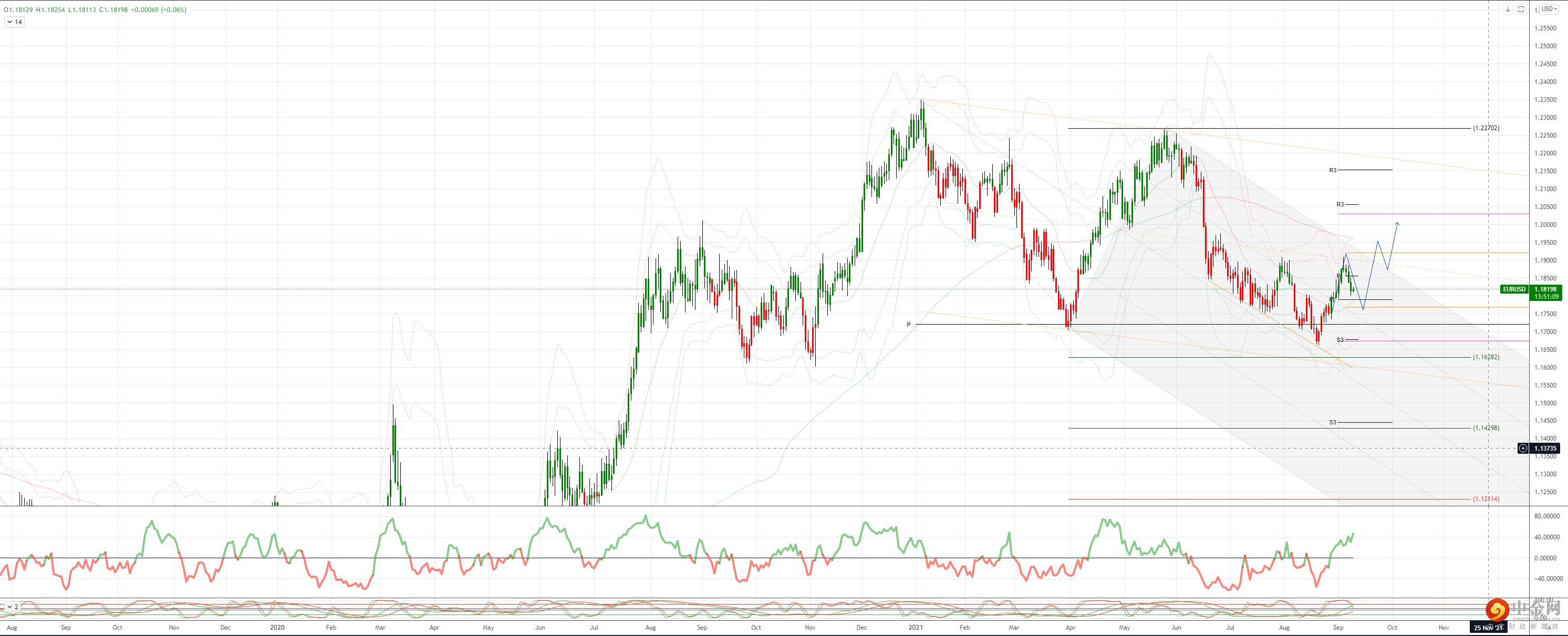 支撑位在 21 日均线 1.1784 处,突破打开下行
