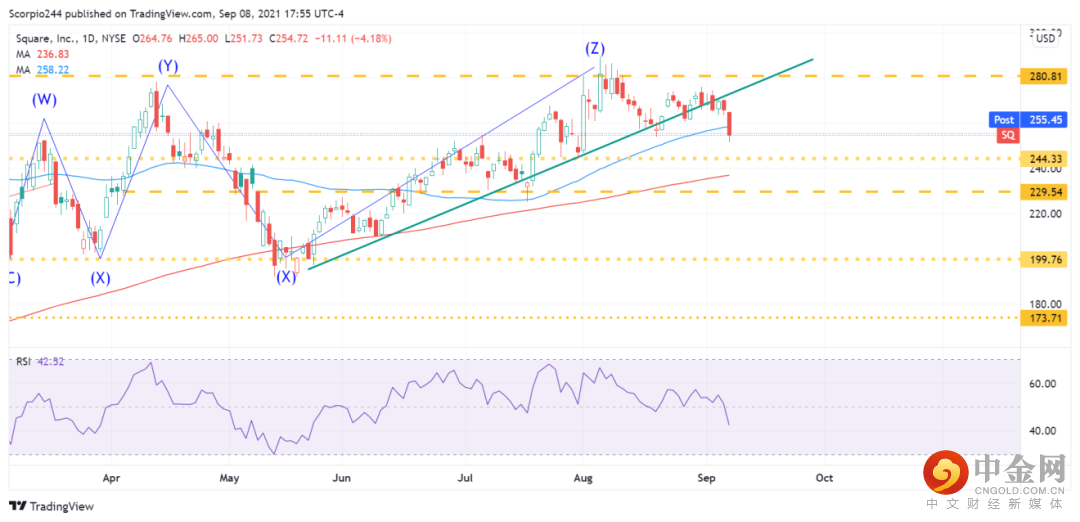 据报道,亚马逊正为第三方卖家开发POS系统。Square公司受到这一消息的冲击,今天股价下跌逾4%。Square公司的相对强弱指数RSI预示着下跌尚未结束,直至245美元处才有支撑线。