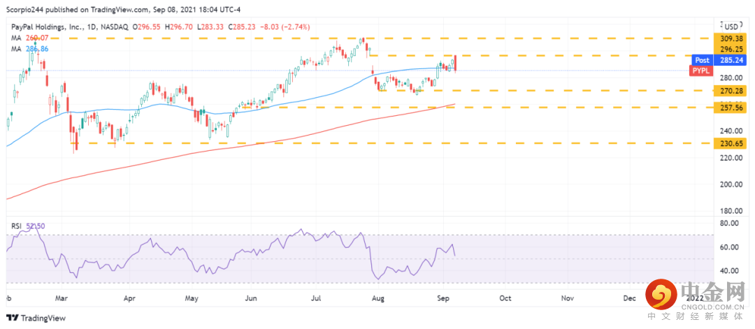 贝宝的股票同样表现不佳。幸运的是,贝宝的股票可能先填补缺口;现在,贝宝股价能够继续下跌并回落至270美元。
