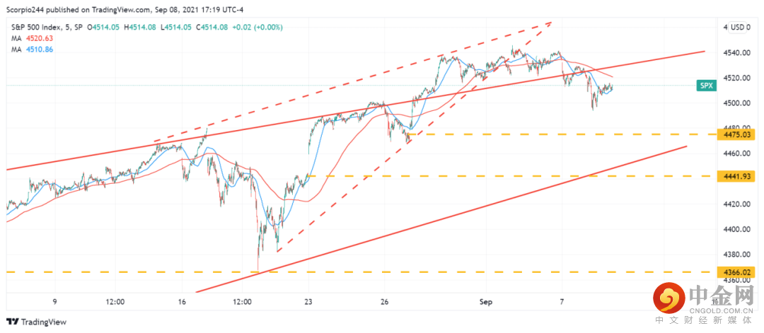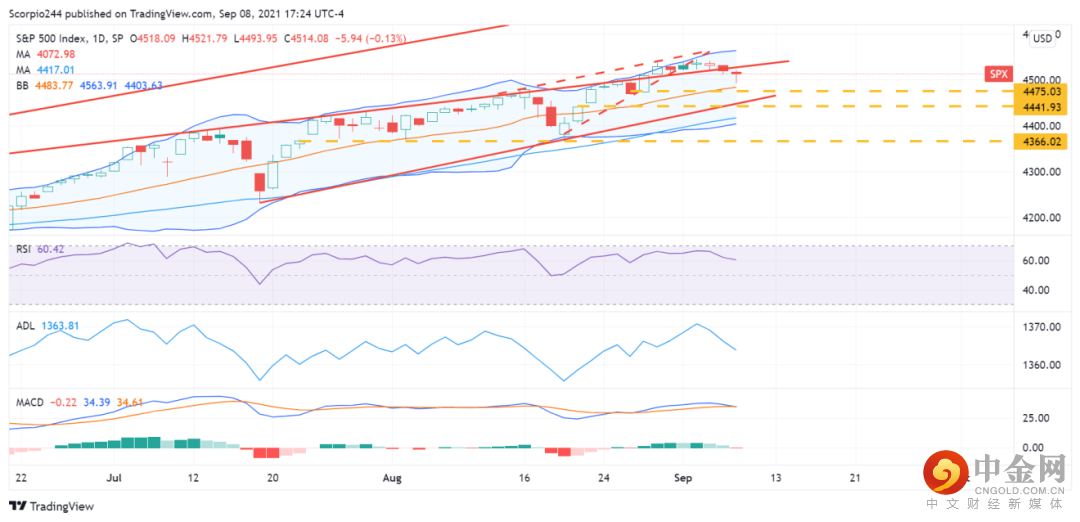 标普500指数目前正位于布林带的中部,在4475点附近有一个缺口同时作为20日移动均线可能提供支撑。