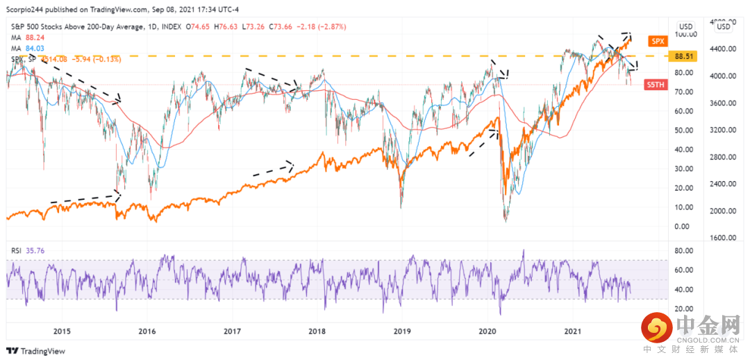 标普500指数中价格超过其200日移动均线的公司股票百分比继续下滑,降至73.6%。