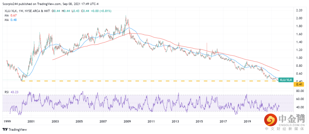 公用事业指数基金与科技股指数基金的比较图表显示出类似的情况。实际上,科技股板块相比公用事业板块的估值达到如此高度是在2020年3月。两个图表看起来都表明风险偏好的情绪已达到了顶点。