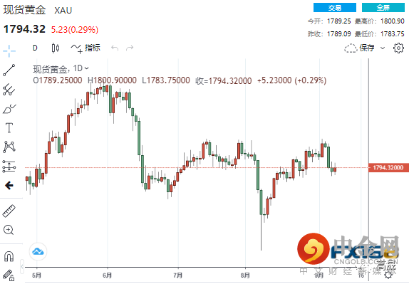 美市尾盘,现货黄金收报1794.32美元/盎司,上涨5.23美元或0.29%,为4日以来首次收涨,盘中最低触及1783.75美元/盎司,最高触及1800.90美元/盎司。