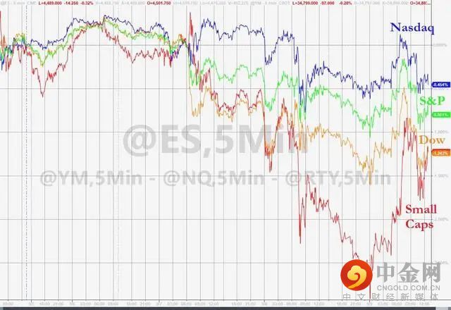 三大美国股指集体高开,标普500指数和道琼斯工业平均指数均在早盘尾声时短线转跌,午盘和纳斯达克综合指数集体转跌,并刷新日低。早盘刷新日高时涨近190点的道指午盘跌超百点,刷新日低时跌超180点,早盘曾涨超0.3%的标普午盘一度跌近0.5%。早盘曾涨超0.4%的纳指午盘曾跌近0.3%。