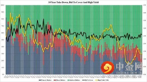 包括外国央行在内的间接投标人获配比例继续高达逾7成,为71.1%,这证明外国买家需求依然强劲。包括美联储和其他美国联邦政府实体在内的直接购买人获配16.6%。而具有购买所有未能拍出国债以防止拍卖流产义务的一级交易商获配比例为12.3%,远低于近期的平均水平19.5%。