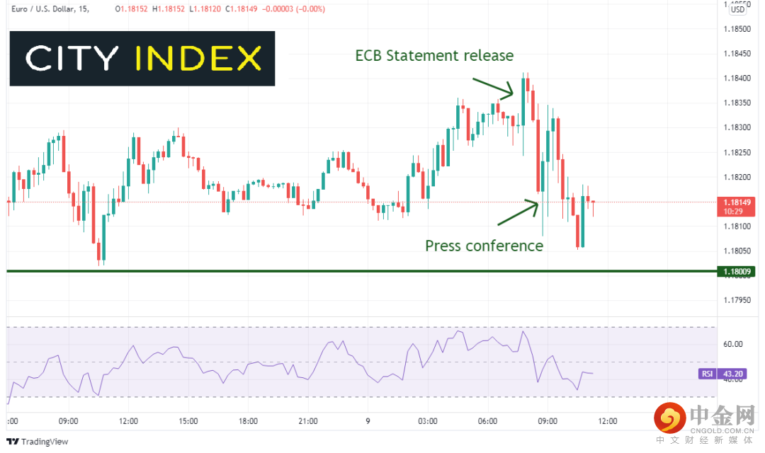 欧洲央行周四会议做出的决议,可能令那些期待央行宣布具体缩减数字的交易者感到失望。一开始,交易者听闻债券购买的节奏放慢,欣然将欧元/美元自1.1830推高至1.1841。但交易者很快意识到,央行没有规定具体数字,做出的声明也较为温和,因此迅速撤掉买盘,导致欧元/美元在新闻发布会进行期间跌至1.1808。