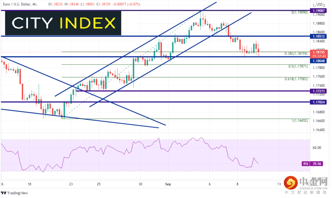 欧元/美元4小时图守住8月20日低点到9月3日高点的38.2%回档位,即1.1815附近,以及水平支撑位1.1804,下个支撑位在同期行情的50%回档位1.1787与61.8%回档位1.1758。