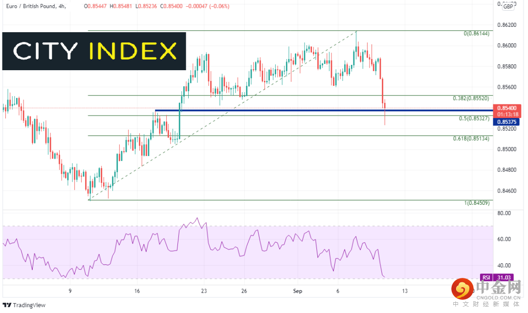 欧元/英镑则受到英国央行行长早些时候的评论与温和欧洲央行的双重打击,下破8月10日低点到9月7日高点行情的38.2%回档位,即0.8552附近,以及水平支撑位和同期行情的50%回档位0.8538/0.5832一线。但欧元/英镑的RSI正逼近超卖区域,或准备反弹。如果失守50%回档位,欧元/英镑可能跌至61.8%回档位0.8513。
