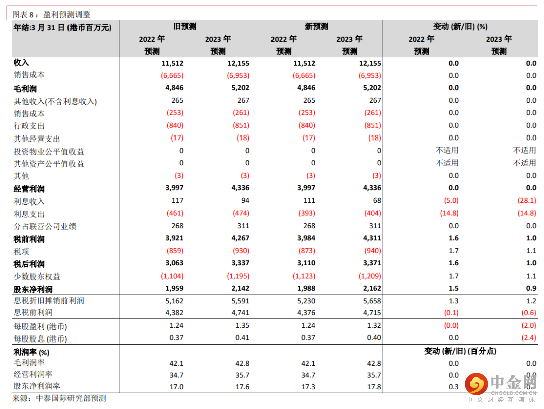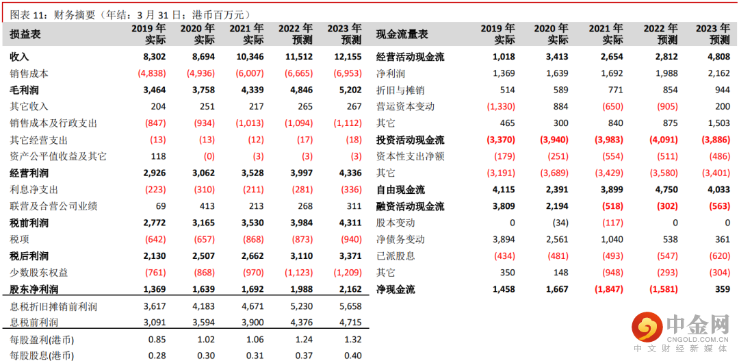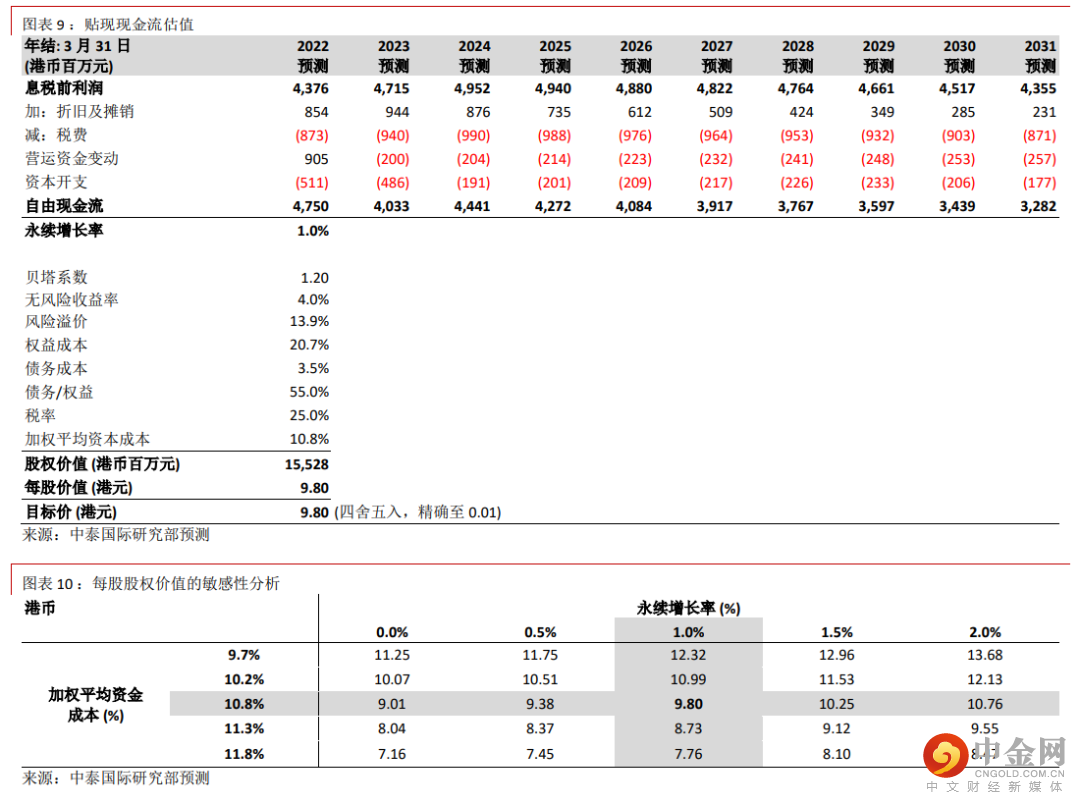 我们相应将贴现现金流分析(DCF)推算的目标价由 9.60 港元提升至 9.80 港元(见图表 9、10),对应 7.9 倍2022 年财年市盈率和 20.4%上升空间。重申“买入”评级。