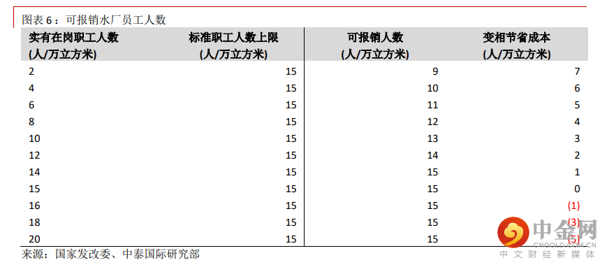 水费定价除了考虑准许收益,也包含准许成本及税金。我们认为新定价方式有利高效运营商,例如中国水务。首先是人工费方面。根据《监审办法》,按日生产能力计算,水厂的员工标准上限为 15 人/万立方米。如果运营商监审期间最后一年实有在岗职工人数低于上限,员工人数按标准上限和实有在岗员工人数的平均值计算。如果实有在岗职工人数超过标准上限的,员工人数按标准上限计数。换言之,实际员工数目愈少,变相可节省人数成本愈高(见图表 6)。根据我们了解,公司运营效率高,在岗员工人数一般为 2-3 人/万立方米。公司因此可变相节省不少成本。水费新定价方式也考虑自用水率及漏损率因素。按照《监审办法》,自用水率原则上据实核定,但也应该在水厂设计水量的 5-10%内。我们估计,中国水务的自用水率约 2-4%,超过新规则要求。另一方面,漏损率原則上則不可以高于《城镇供水管网漏损控制及评定标准》(CJJ92)的一级评定标准,即是 10%,超出部分不得计入成本。公司 2020 年财年漏损率为 14.3%,超出上述标准,但是已经高出很多中小型地市的 30%漏损率。我们所了解,一些行业人士估计地方政府未必完全执行此 10%漏损率标准,否则很多运营商需要面对较高运营成本水平。