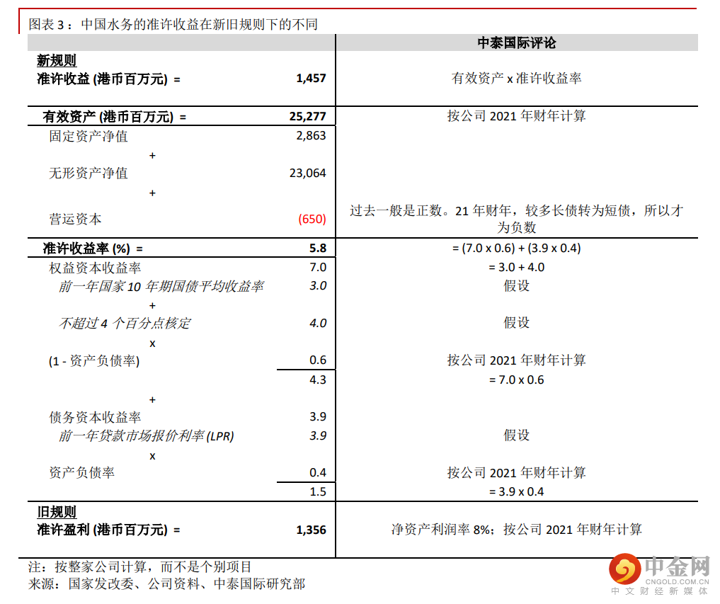 《管理办法》新版明确水费定价的方法(见图表 2)。当实际供水量不少于设计供水量的 65%,供水价格 =准许收入 ÷ 核定供水量。当实际供水量少于计供水量的 65%,供水价格 = 准许收入 ÷{核定供水量÷[(实际供水量 ÷(设计供水量×65%)]}。对于自来水供应运营商,准许收益是其中重要部份。以中国水务为例子。接旧规则,公司的准许收益是按项目公司的净资产回报率的 8%计算。在新规则下,准许收益则按投资资本回报率模式计算,相当于,有效资产 x 准许收益率。有效资产则相等于,固定资产净值 + 无形资产净值 + 营运资本。假如接整家公司计算,在新规则下,我们推算公司的准许收益较旧规则下,理论上可高出 7.5%(见图表 3、4、5)。