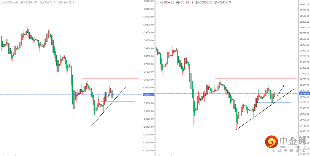 恒生指数天图:短期价格在回测下方水平支撑带25866.99附近再次测试起稳,并且下方有上升趋势线的支撑作用。从日内4小时级别,价格在多重支撑节点附近有效测试。可继续关注上行的多头机会,上方区间目标位置参考26736.73一带。