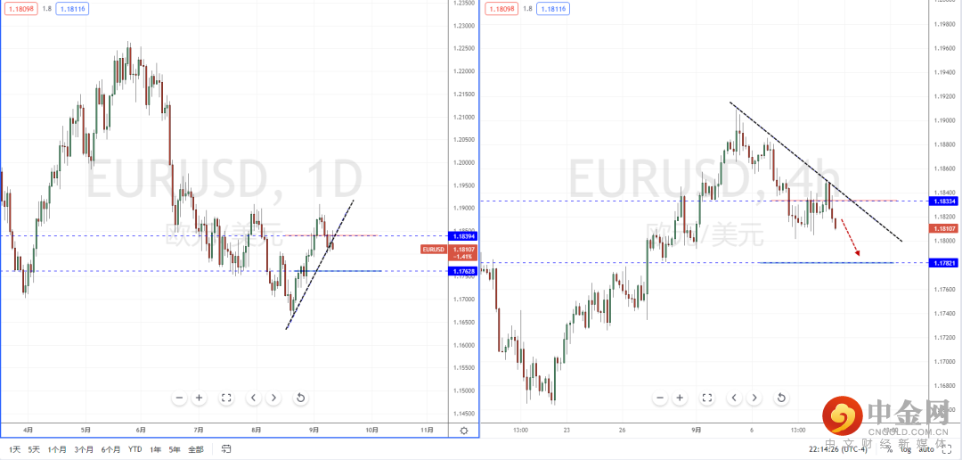 欧美天图:目前行情在上方水平压制带1.18394附近承压受阻后继续下行,其上升趋势线也被跌破,现阶段趋势属于偏空节奏。从日内4小时级别,价格在回测上方压制带区域受阻后破位下行。可适当关注价格调整后短线的空头机会,下方目标位置参考1.17821一带。