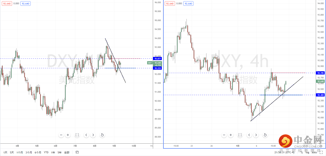 美元指数天图:现阶段行情虽然趋于偏多,但行情在突破下降趋势线压制后,在窄幅区间内调整。上方水平压制带在92.877附近,下方支撑在92.333一带。从日内4小时级别,短期价格在回测节点后起稳,可适当关注短线多头机会,需要注意上方空间幅度,目标位置参考92.785附近。