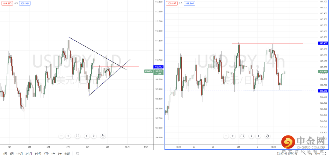 美日天图:目前行情依然在第二象限中纠结,上方水平压制带在110.157附近,下方又有上升趋势线的支撑作用。其趋势进入鸡肋阶段,从日内4小时级别,价格继续保持在宽幅区间内调整,可适当关注价格回测支撑后,短期反弹机会。