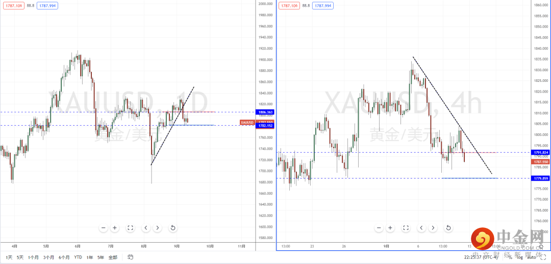 黄金天图:目前行情处于在空头阶段中,在上升趋势线跌破后继续在窄幅区间内纠结。上方水平压制带在1806.363附近,从日内4小时级别,价格在回测上方压制区域后再次破位。可适当关注价格调整后的短线空机会,下方目标位置参考1779.859一带,需要注意下方空间幅度。