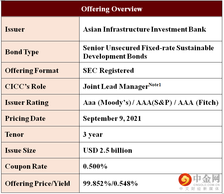 On September 9th, the Asian Infrastructure Investment Bank (AIIB) priced a new USD 2.5 billion SEC Registered Global Sustainable Development Bond 3-year benchmark transaction due October 2024. The transaction priced at SOFR MS + 16bps, equivalent to a reoffer yield of 0.548% and spread of 11.8bps versus CT3. CICC acted as the Joint Lead Manager of this transaction.
