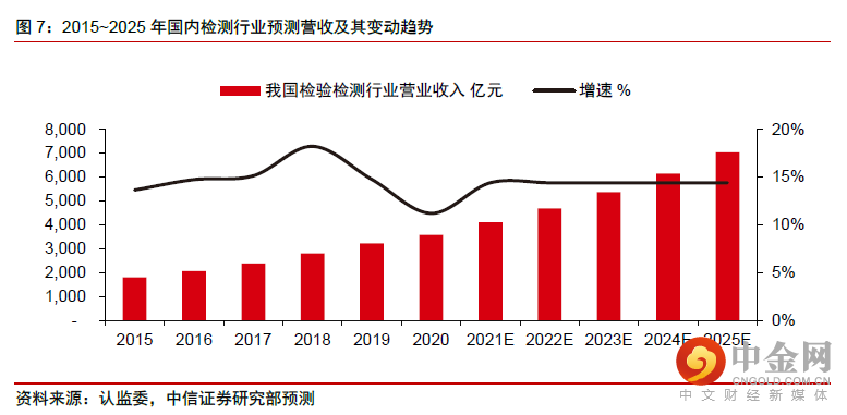 从“中国制造”到“中国质量”阶段的企业内在需求、居民消费升级和政府监管标准提升等动力将推动检测长期繁荣,2013-2020年行业维持双位数高增,预计“十四五”期间该增速仍将维持,国内检测市场2025年预计将增至约7,000亿元。