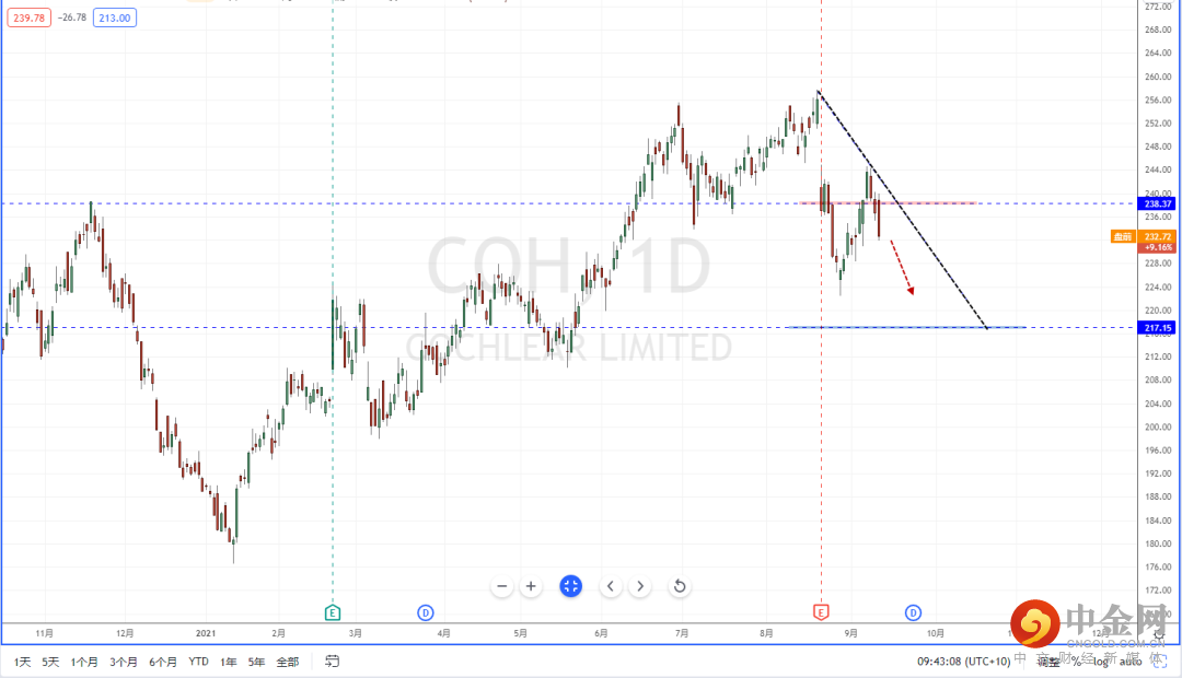 COH:近期市场数据喜忧参半,并且ETF产业也纷纷处于在拐头下行阶段中。从目前的COH整体趋势的表现也处于在回测后第二阶段的空头区间。上方有下降趋势线的压制作用,其水平压制带在238.37附近。短期可适度关注价格调整后继续走弱下行的空头机会,下方区间目标位置参考217.15一带。