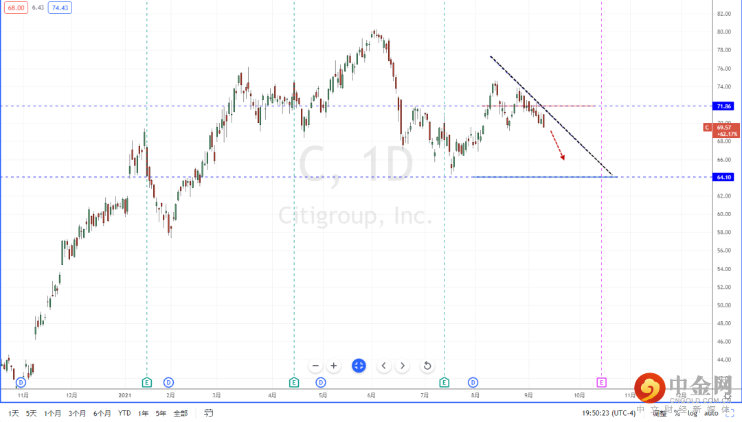 C:由于近期市场乐观情绪低迷,并且相关数据也是喜忧参半,尚未有效刺激市场,从ETF产业的表现,大部分产业都处于拐头下行中。从C目前整体趋势其价格在上方压制带71.86破位后继续受阻,并且上方有下降趋势线的压制作用。可适当关注价格调整后继续走弱的空头机会,下方目标位置参考64.10一带,