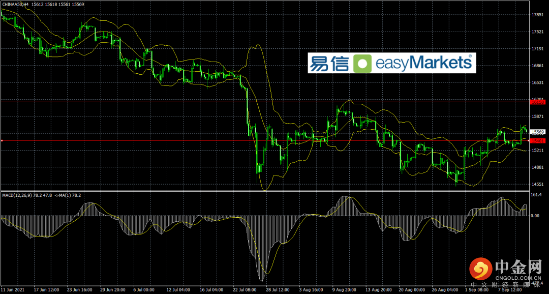 技术看,A50支撑是15400附近,破位看15200附近,上方压力是15700附近,突破则看16000附近。指标看布林线开口横盘,MACD在高位震荡略回落,鉴于下方位置重要性,可以尝试逢低多交易,跌破支撑,多头离场。