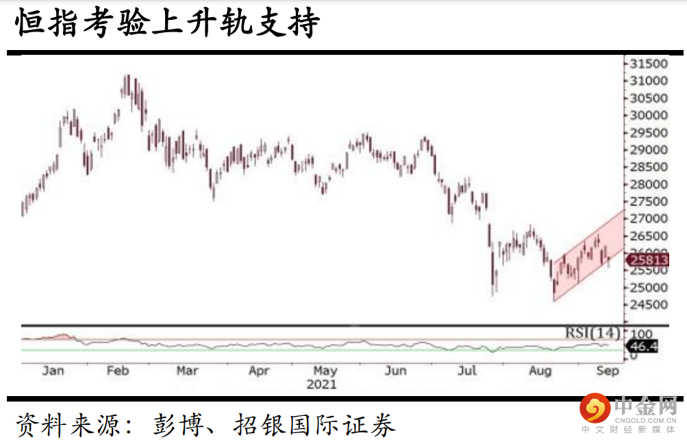 科网股受压,资源股强势。港股上周五大幅反弹后,昨天回落,恒指最多跌635点,收市跌392点或1.50%,科技指数跌2.27%,大市成交1,503亿港元,环比变动不大。科网股继续受监管风险拖累,美团(3690 HK)和阿里巴巴(9988 HK) 跌逾4%。纽约期油重上70美元,资源股逆市上涨,「三桶油」升2.3%至5%,中铝(2600 HK)涨8.1%,江西铜(358 HK)升5.8%。美股昨天上升,能源股和金融股领涨,带动道指升0.76%,结速连续五天的跌势,科技股则跑输,纳指微跌0.07%。市场观望今晚美国公布8月份消费物价指数(CPI),及苹果公司(AAPL US)的产品发布会,预计新产品包括iPhone 13, AirPods 3和 Apple Watch 7。图表上,恒指昨天曾跌穿短期上升通道,收市重回通道之中,若确认跌穿升轨,恐怕将再试近期低位25,000以下。