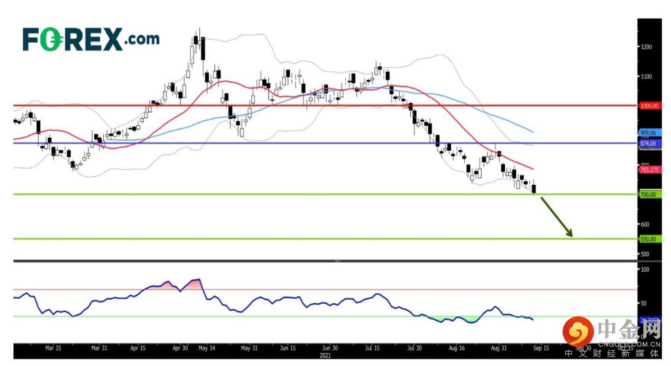 若铁矿石期货价格跌破700元人民币大关,将很大机会下滑至550元人民币。看跌的主要阻力 (止损) 位在874元人民币 (近布林带上线)。