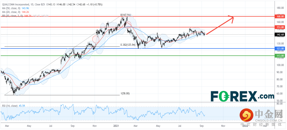 从技术角度看,如日线图所示,高通维持温和上涨的走势。它在今年上半年到达38.2%费波纳奇回档位后站稳,50日移动均线已反转向上。