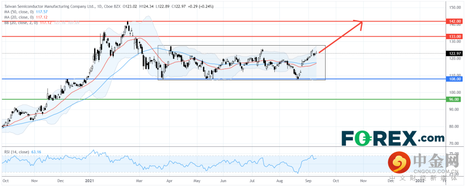 从技术角度看,如日线图所示,台积电在3月以来的盘整区内交投。目前它在20日及50日移动均线上方交投,相对强弱指标支持看涨趋势。