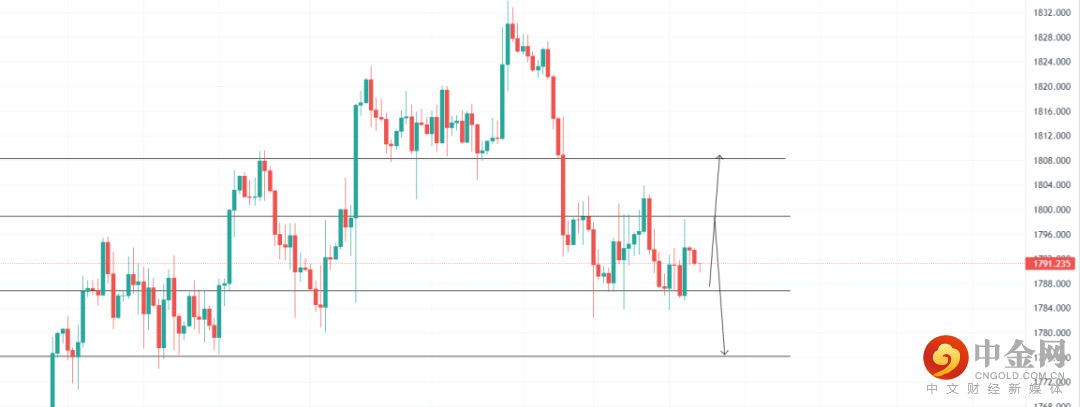 美元指数受支撑,黄金下跌,关注1786.86的支撑位,4小时回调收多即可看多至压力位1808.29位置,止损1783.53;关注1798.92压力位,4小时受阻收空即可看空至1776.21,止损1801.59