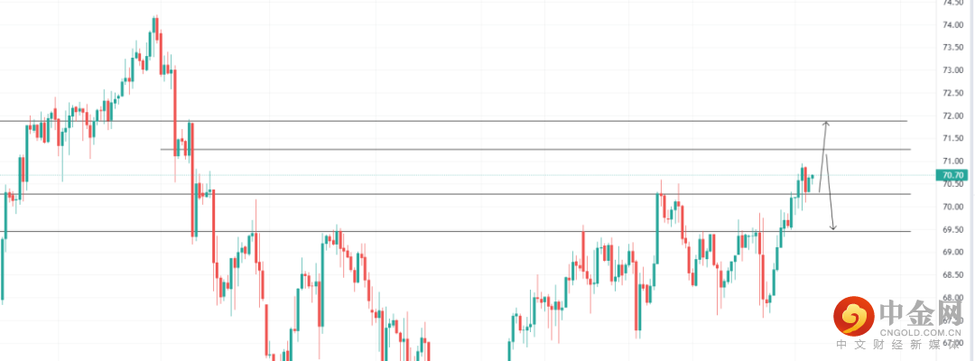 美元指数受支撑,原油支撑,关注70.27的4小时支撑位置,回调收多可看多至71.88,止损70.00;关注71.26 压力位,4小时受阻收空即可看空至69.45,止损71.40