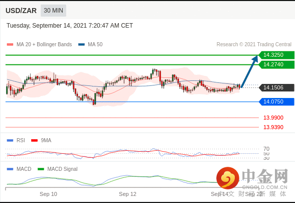 RSI 低于 50。MACD 高于其信号线且为负值。配置是混合的。此外,价格高于其 20 周期移动平均线 (14.1440),但低于其 50 周期移动平均线 (14.1660)。