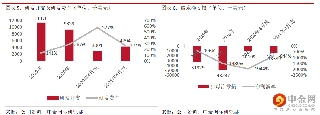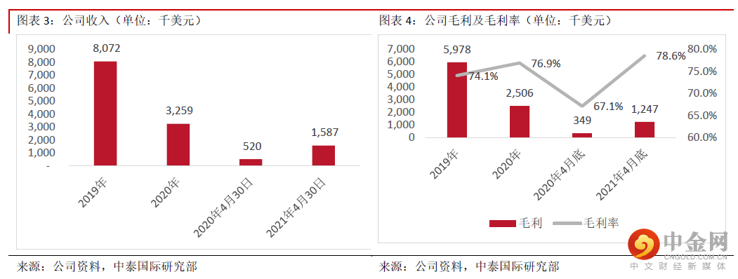 财务分析:公司尽管已经实现了商业化收入,但目前依然处于亏损状。2019、2020财年及2021年前4个月,公司收入分别为807.2万美元、325.9万美元及158.7万美元;毛利率持续增长,分别为74.1%、76.9%及78.6%;研发开支分别为1,137.6万美元和935.3万美元及429.4万美元,分别占收入的140.9%、287.0%及270.6%;同期销售及分销开支为860.9万美元、635.2万美元及322.2万美元,分别占收入的106.7%、194.9%及203.0%;股东净亏损分别为3,192.9万美元、4,823.7万美元及1,338.9万美元;年末现金及现金等价物分别为308.5万美元、1,878.8万美元及4,336.5万美元。