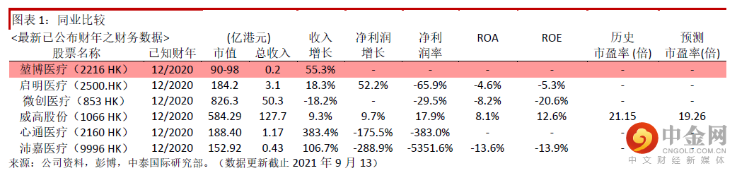 同业比较及估值水平:我们选取5家医疗器械公司启明医疗(2500 HK)、微创医疗(853 HK)、威高股份(1066 HK)、心通医疗(2160 HK)、沛嘉医疗(9996 HK),平均市值为390亿港元。公司按全球公开发售后的5.26亿股本计算,对应市值为90-98亿港元。