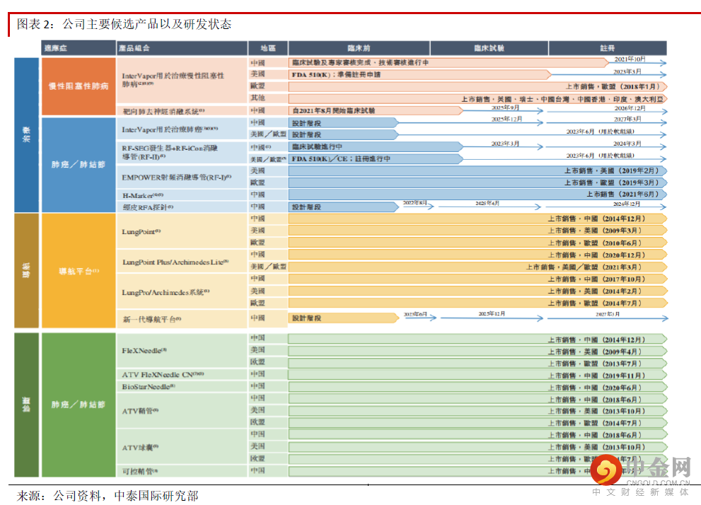 公司的另一款核心产品RF-II射频消融系统,可通过支气管镜作用于肺部肿瘤,对肺部肿瘤进行消融。该产品已经完成首次用于人体的临床试验,并且正在准备申请RF-II的FDA 510k的申请批准函。RF-II无须获得国家药监局的预审批即可开展注册性试验。公司计划在中国内地、欧盟及美国注册RF-II。RF-II的竞争对手包括Nuvaira的dNerva肺去神经系统、Balmer Medical的RITA射频消融、波士顿科学公司(BSX US)的RF3000射频消融系统,以及美敦力(MDT US)的Cool-tip射频消融系统。此外该款产品预计于2022年11月提交FDA注册,2023年第三季度在欧盟及中国提交注册。根据弗若斯特