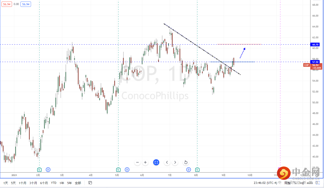 COP:虽然近期市场处于在低迷阶段中,但从COP目前整体趋势的表现在短期调整后坚决向上突破,并且有效站上水平压制带57.50附近。短期可适当关注价格小幅调整后上行的多头机会,上方区间目标位置参考60.70一带。