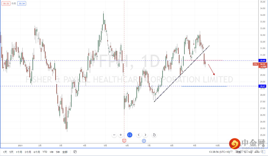 FPH:由于近期市场相对反复,从ETF产业标的表现中,再次处于在低迷阶段中。从FPH整体趋势处于在空头阶段中,并且价格坚决跌破上升趋势线与水平支撑带30.60附近。短期可适当关注价格调整后继续走弱下行的机会,下方目标位置参考28.67附近。