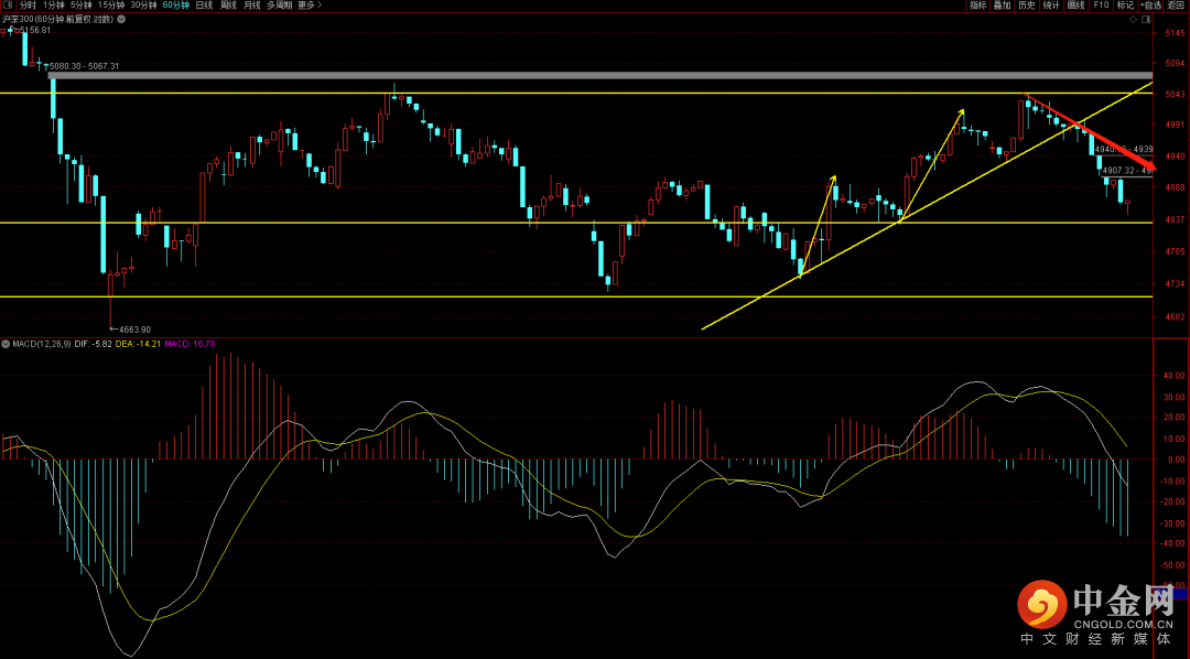 沪深300目前六十分钟进入了顶背驰结构调整,目前已经走了两天后续大概率还需要四天的调整,短期大概率较难出现强势上升,重点关注日线底分型何时出现。