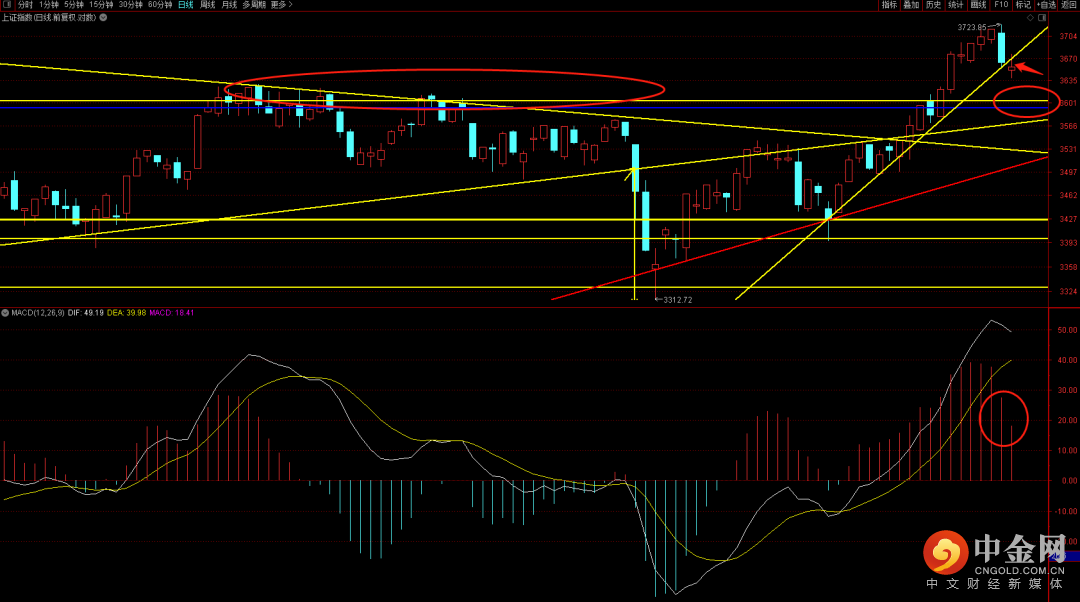 大盘早盘低开向下在3638附近遇到支撑后反抽回补缺口,之后再次出现跳水,短期出现五分钟底背弛结构,后续观察3677是否能够突破,如果无法突破则在后续三天内无法回升到快速上升趋势线上则可能会再次回踩3593到3600的区间支撑。