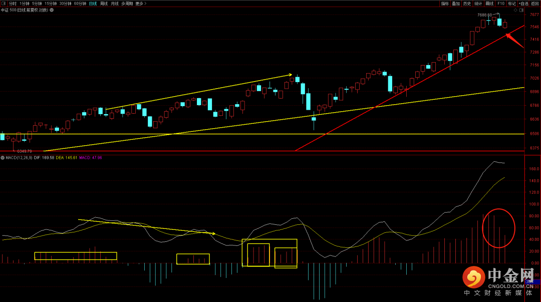 中证500目前出现调整信号,短期关注快速上升趋势线支撑,如果跌破调整周期可能出现拉长。